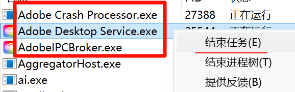 Ctrl+Shift+Esc打开任务管理器,切换到详细信息选项卡。右键点击所有与 Adobe 相关的进程,将它们结束运行