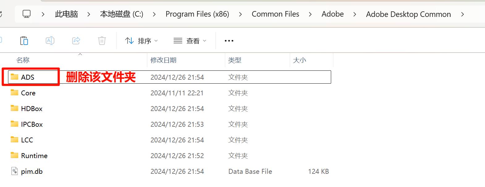 C:\Program Files (x86)\Common Files\Adobe\Adobe Desktop Common,将目录下的ADS文件夹删除